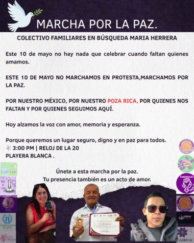 Colectivos de búsqueda convocan a marcha por la paz este 10 de mayo en Poza Rica