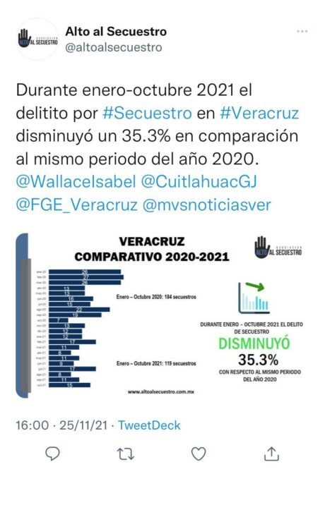 Los datos verificados por la organización Alto al Secuestro coinciden con las cifras oficiales emitidas por el Secretariado Ejecutivo del Sistema Nacional de Seguridad Pública, el cual ha señalado la tendencia a la baja de este delito en el Estado de Veracruz.