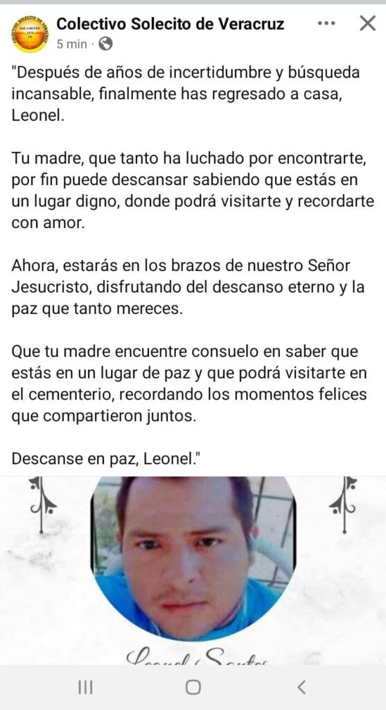“Después de años de incertidumbre y búsqueda incansable, finalmente has regresado a casa, Leonel”, publicó el colectivo en sus redes sociales. El mensaje, acompañado de una imagen suya, rinde homenaje a su memoria y a la lucha de su madre, quien nunca cesó en su afán por encontrarlo.