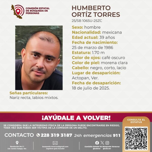 Darío Pale Xalapa, Ver.- Familiares de Humberto Ortíz Torres denunciaron su desaparición ocurrida el pasado 18 de julio de 2025 en el municipio de Actopan, Veracruz. Desde entonces, no han…