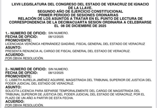 Xalapa, Ver.-El Congreso del Estado de Veracruz recibió este lunes 08 de diciembre la renuncia de Verónica Hernández Giadáns a la titularidad de la Fiscalía General del Estado (FGE), cargo que desempeñó por más de seis años.