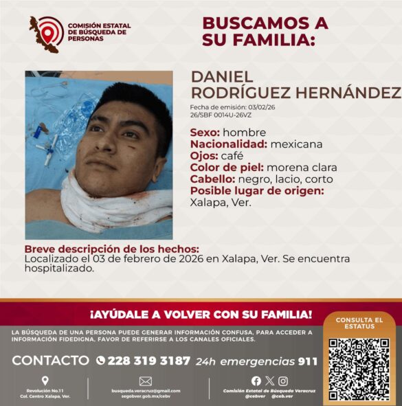 Xalapa, Ver.— La Comisión Estatal de Búsqueda de Personas de Veracruz solicita el apoyo de la ciudadanía para localizar a la familia del C. Daniel Rodríguez Hernández, quien fue localizado el pasado 3 de febrero de 2026 en el municipio de Xalapa y actualmente se encuentra hospitalizado.