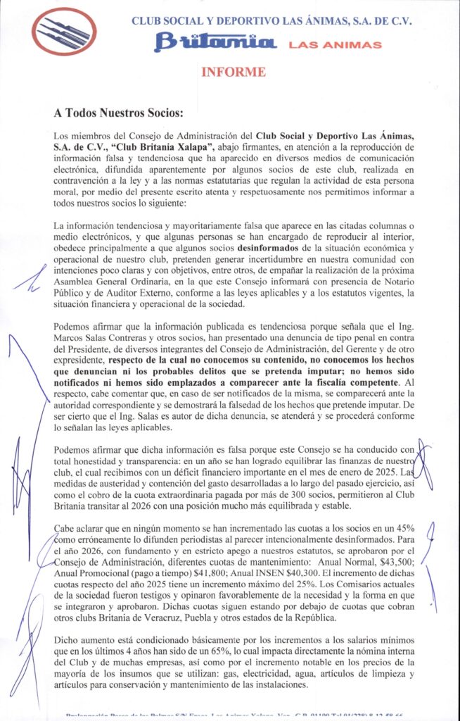 Xalapa, Veracruz, 14 de abril de 2026.— El Consejo de Administración del Club Social y Deportivo Las Ánimas, S.A. de C.V., conocido como Club Britania Xalapa, emitió un informe dirigido a sus socios en el que rechaza la difusión de información que califica como “falsa y tendenciosa” sobre la situación financiera y operativa de la institución.