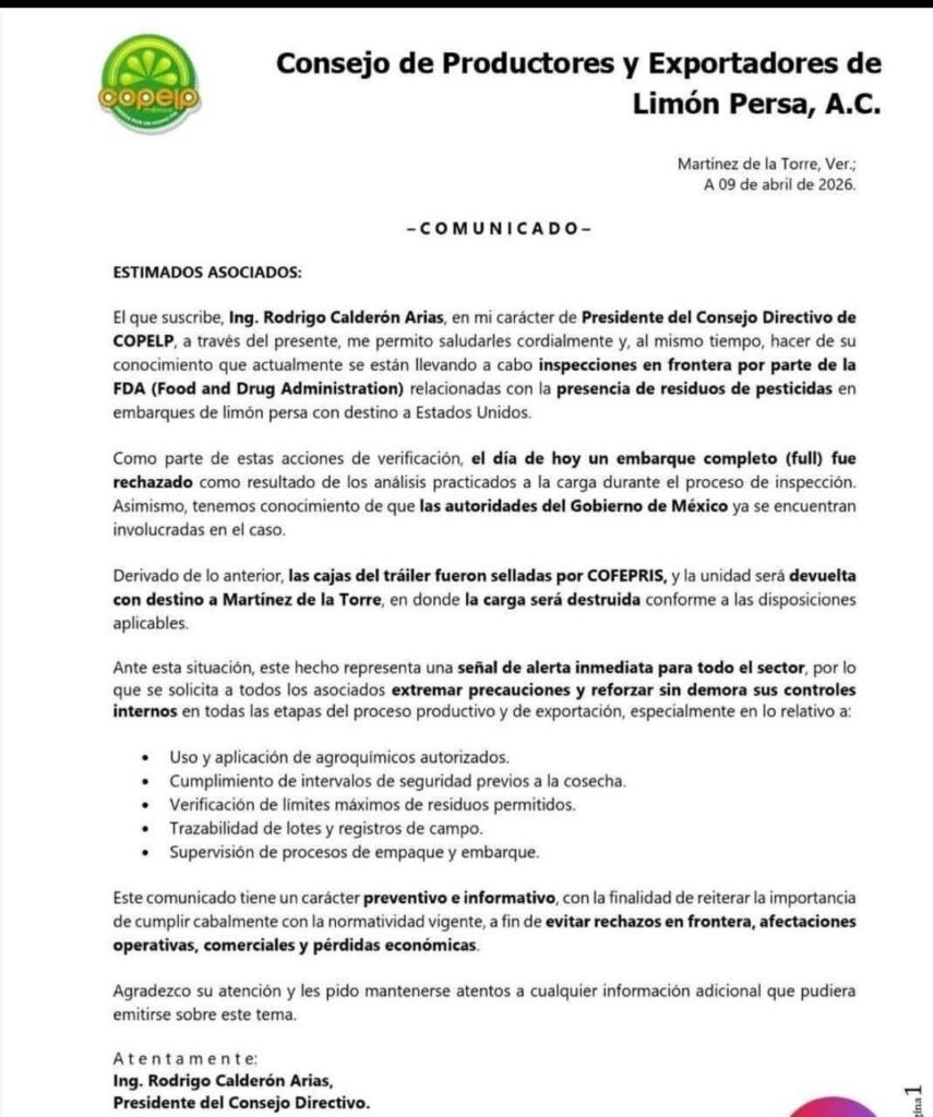 Martínez de la Torre, Ver.-Un cargamento completo de limón persa destinado a exportación hacia Estados Unidos fue rechazado en la frontera tras detectarse residuos de pesticidas durante inspecciones realizadas por la FDA (Food and Drug Administration), informó el Consejo de Productores y Exportadores de Limón Persa, A.C. (COPELP).