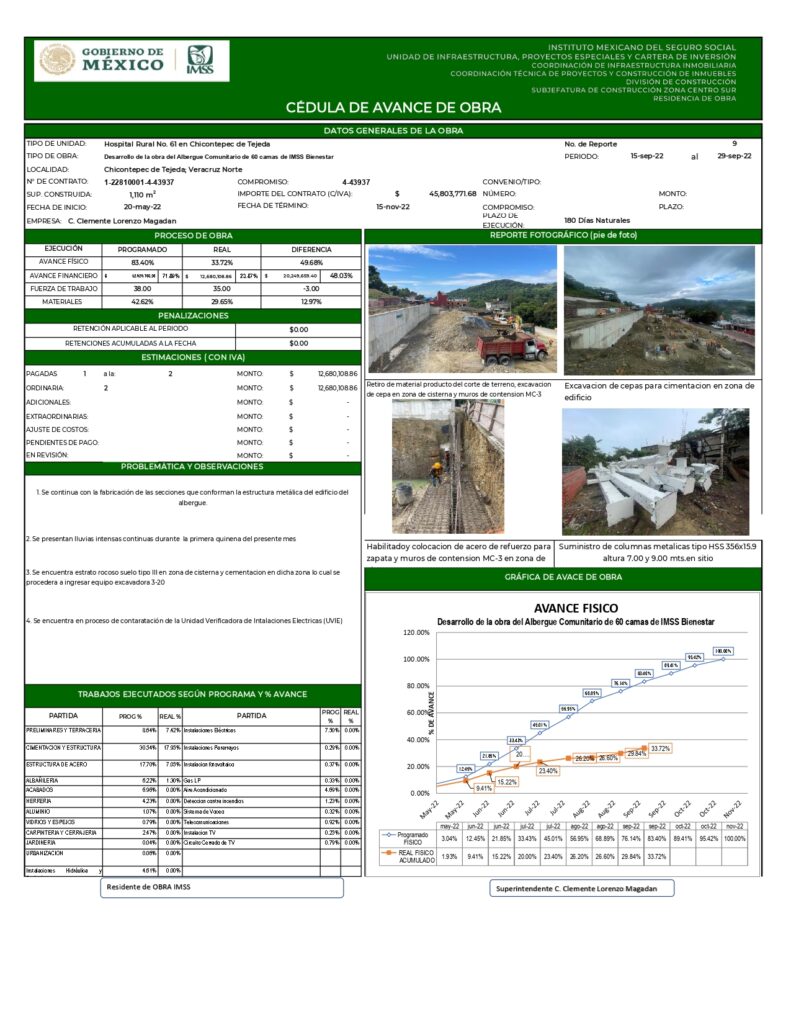 De acuerdo con información oficial, la obra —identificada con el contrato número 1-22810001-4-3937— contemplaba la edificación de un albergue de 60 camas en una superficie de mil 110 metros cuadrados. Este espacio tenía como objetivo brindar hospedaje y alimentación a familiares de pacientes de escasos recursos que acuden al hospital rural No. 61.