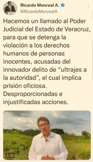 Darío Pale/ El senador de Morena Ricardo Monreal denunció públicamente en sus redes sociales el abuso del delito de ultrajes a la autoridad en Veracruz, por lo que hizo un…
